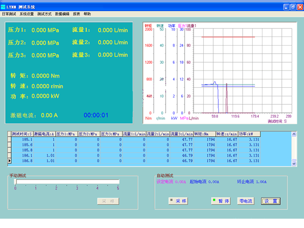 - 系統(tǒng)通過1臺相位差式轉矩轉速傳感器及1臺TR-1C轉矩轉速采集儀(或TR-1D轉矩轉速采集儀)采集馬達的輸出轉矩和轉速;用1臺LY-1型數(shù)據(jù)采集儀采集流量和壓力;用1臺TEM-2溫度采集儀檢測溫升;用WLK-3B程控電源控制磁粉制動器對馬達進行加載。